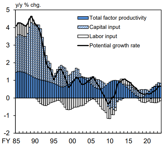 [3] Bank of Japan, “Results of the ‘Survey regarding Corporate Behavior since the Mid-1990s’” (May 2024). This survey found that respondents pointed to (1) the COVID-19 pandemic, (2) bubble burst and ensuing financial crisis, (3) global financial crisis, (4) declining and aging population” as the events and factors that led to domestic businesses being more or less active more often than they blamed “sluggish prices.”